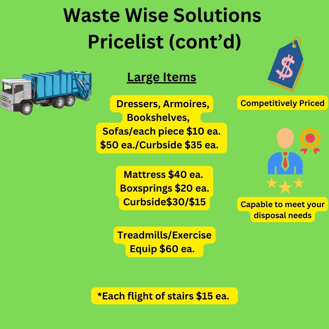 2. Eco-Friendly and Responsible Disposal 🌲We are committed to environmentally responsible practices. Waste Wise Solutions prioritizes recycling, donating, and proper disposal of all items we collect. By choosing us, customers can be confident that their unwanted items are being handled in a way that minimizes environmental impact and promotes sustainability.